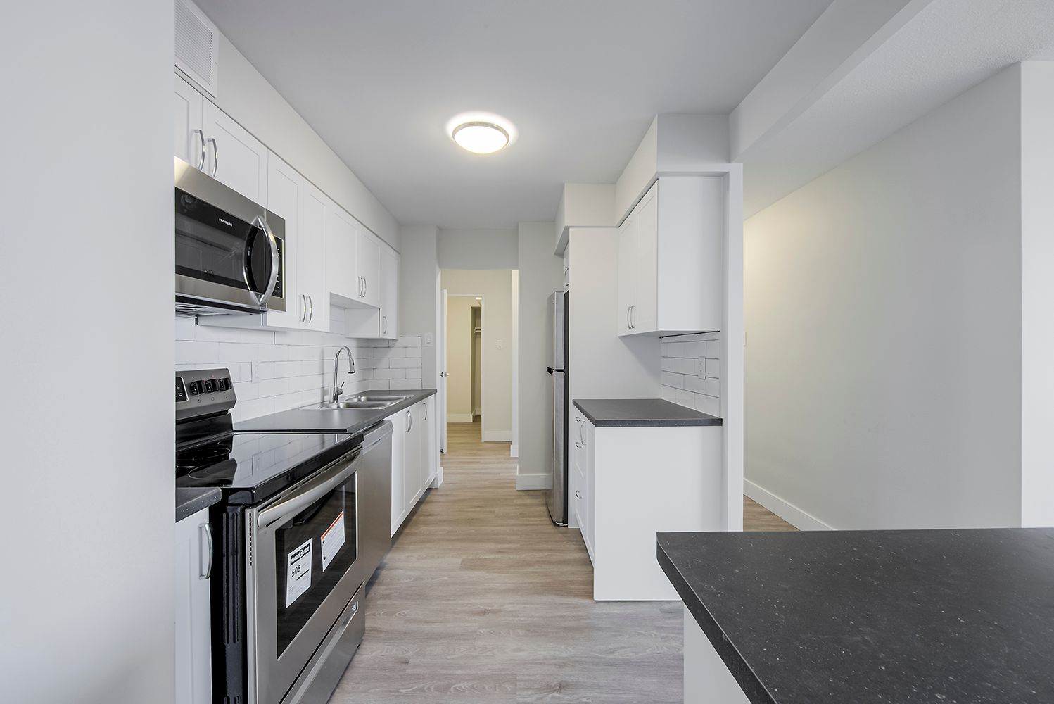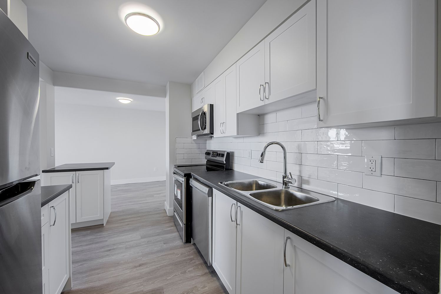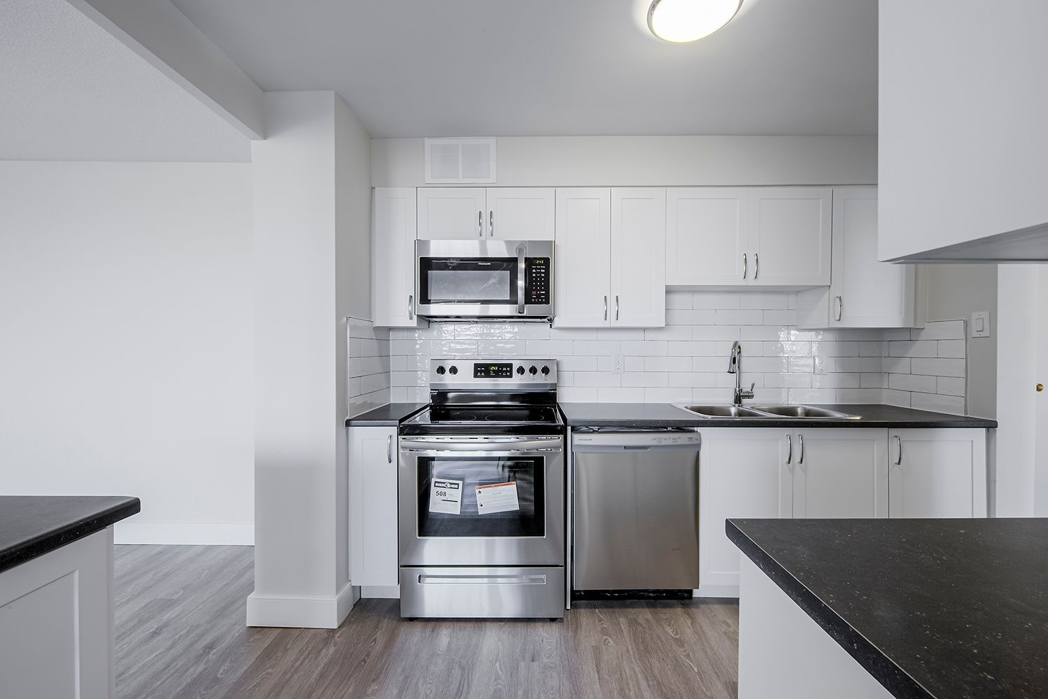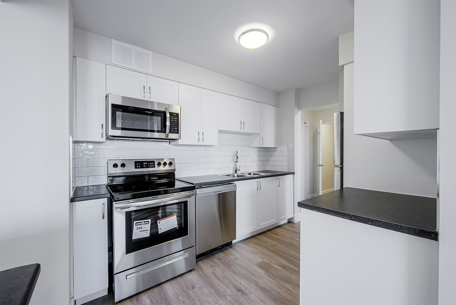 Our renovated suites offer open-concept layouts, new laminate plank flooring, remodeled kitchens, stainless steel appliances, and remodeled bathrooms.
